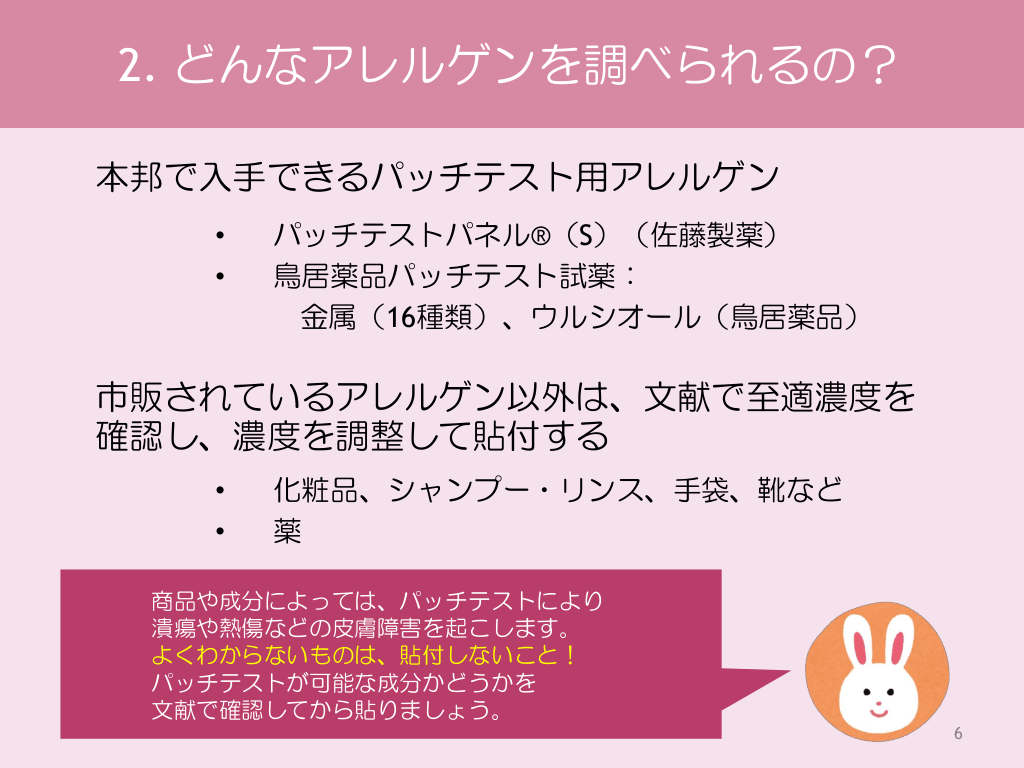 #6. 2. どんなアレルゲンを調べられるの? 本邦で入手できるパッチテスト用アレルゲン • • パッチテストパネル®(S)(佐藤製薬) 鳥居薬品パッチテスト試薬: 金属(16種類)、ウルシオール(鳥居薬品) 市販されているアレルゲン以外は、文献で至適濃度を 確認し、濃度を調整して貼付する • • 化粧品、シャンプー・リンス、手袋、靴など 薬 商品や成分によっては、パッチテストにより 潰瘍や熱傷などの皮膚障害を起こします。 よくわからないものは、貼付しないこと! パッチテストが可能な成分かどうかを 文献で確認してから貼りましょう。 6