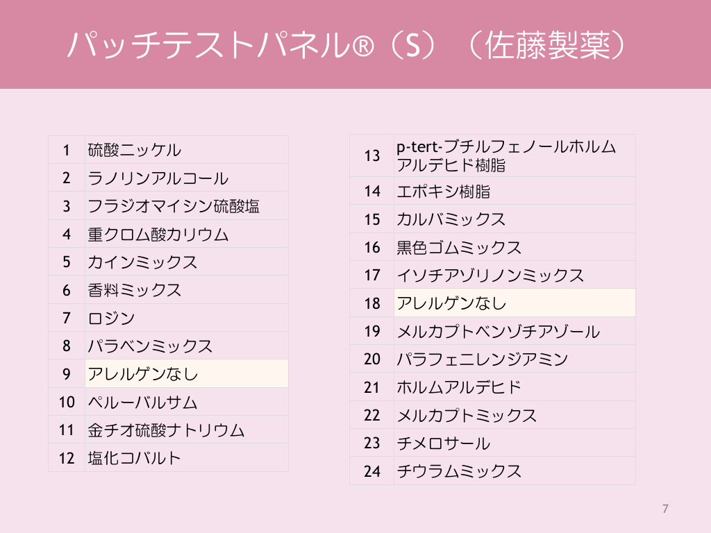 #7. パッチテストパネル®(S)(佐藤製薬) 1 硫酸ニッケル 2 ラノリンアルコール 3 フラジオマイシン硫酸塩 4 重クロム酸カリウム 5 カインミックス 6 香料ミックス 7 ロジン 8 パラベンミックス 9 アレルゲンなし 10 ペルーバルサム 11 金チオ硫酸ナトリウム 12 塩化コバルト 13 p-tert-ブチルフェノールホルム アルデヒド樹脂 14 エポキシ樹脂 15 カルバミックス 16 黒色ゴムミックス 17 イソチアゾリノンミックス 18 アレルゲンなし 19 メルカプトベンゾチアゾール 20 パラフェニレンジアミン 21 ホルムアルデヒド 22 メルカプトミックス 23 チメロサール 24 チウラムミックス 7