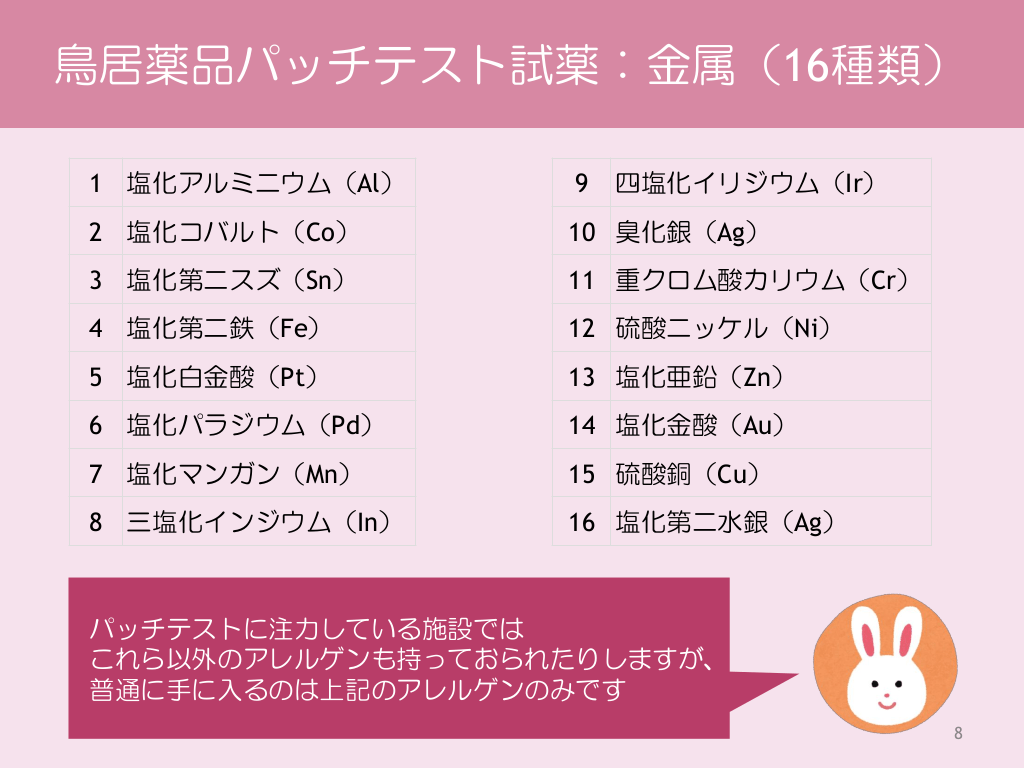 #8. 鳥居薬品パッチテスト試薬:金属(16種類) 1 塩化アルミニウム(Al) 9 2 塩化コバルト(Co) 10 臭化銀(Ag) 3 塩化第二スズ(Sn) 11 重クロム酸カリウム(Cr) 4 塩化第二鉄(Fe) 12 硫酸ニッケル(Ni) 5 塩化白金酸(Pt) 13 塩化亜鉛(Zn) 6 塩化パラジウム(Pd) 14 塩化金酸(Au) 7 塩化マンガン(Mn) 15 硫酸銅(Cu) 8 三塩化インジウム(In) 16 塩化第二水銀(Ag) 四塩化イリジウム(Ir) パッチテストに注力している施設では これら以外のアレルゲンも持っておられたりしますが、 普通に手に入るのは上記のアレルゲンのみです 8