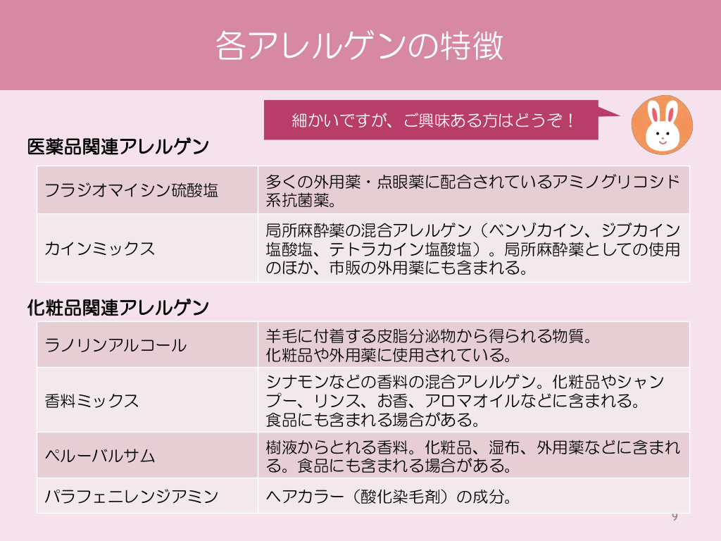#9. 各アレルゲンの特徴 細かいですが、ご興味ある方はどうぞ! 医薬品関連アレルゲン フラジオマイシン硫酸塩 多くの外用薬・点眼薬に配合されているアミノグリコシド 系抗菌薬。 カインミックス 局所麻酔薬の混合アレルゲン(ベンゾカイン、ジブカイン 塩酸塩、テトラカイン塩酸塩)。局所麻酔薬としての使用 のほか、市販の外用薬にも含まれる。 化粧品関連アレルゲン ラノリンアルコール 羊毛に付着する皮脂分泌物から得られる物質。 化粧品や外用薬に使用されている。 香料ミックス シナモンなどの香料の混合アレルゲン。化粧品やシャン プー、リンス、お香、アロマオイルなどに含まれる。 食品にも含まれる場合がある。 ペルーバルサム 樹液からとれる香料。化粧品、湿布、外用薬などに含まれ る。食品にも含まれる場合がある。 パラフェニレンジアミン ヘアカラー(酸化染毛剤)の成分。 9