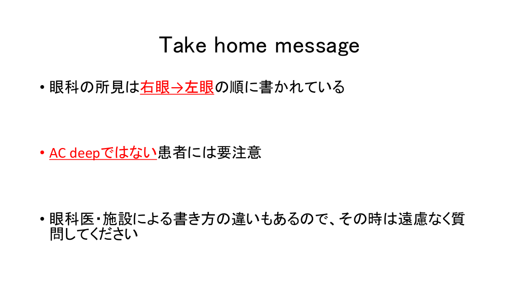 #10. Take home message • 眼科の所見は右眼→左眼の順に書かれている • AC deepではない患者には要注意 • 眼科医・施設による書き方の違いもあるので、その時は遠慮なく質 問してください