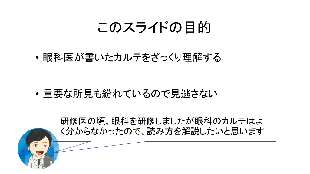 #3. このスライドの目的 • 眼科医が書いたカルテをざっくり理解する • 重要な所見も紛れているので見逃さない 研修医の頃、眼科を研修しましたが眼科のカルテはよ く分からなかったので、読み方を解説したいと思います