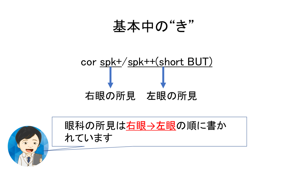 #4. 基本中の“き” cor spk+/spk++(short BUT) 右眼の所見 左眼の所見 眼科の所見は右眼→左眼の順に書か れています