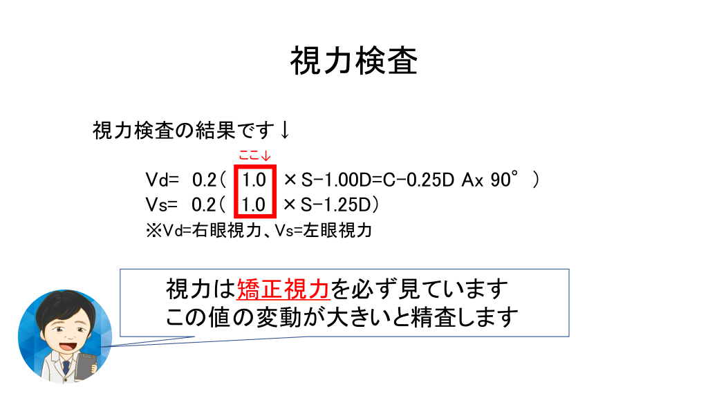 #5. 視力検査 視力検査の結果です↓ ここ↓ Vd= 0.2( 1.0 ×S-1.00D=C-0.25D Ax 90°) Vs= 0.2( 1.0 ×S-1.25D) ※Vd=右眼視力、Vs=左眼視力 視力は矯正視力を必ず見ています この値の変動が大きいと精査します