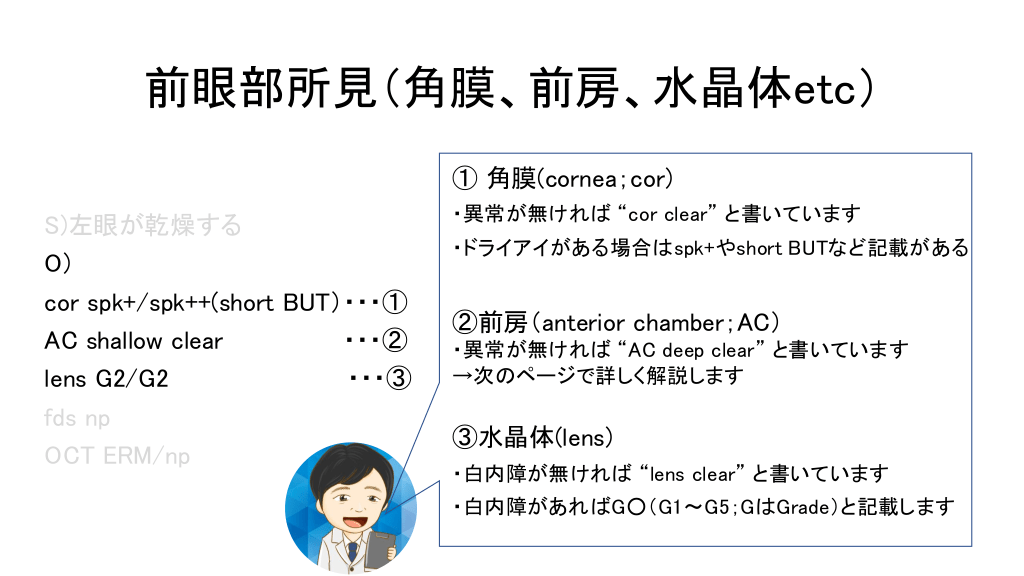 #6. 前眼部所見(角膜、前房、水晶体etc) ① 角膜(cornea;cor) ・異常が無ければ “cor clear” と書いています S)左眼が乾燥する O) cor spk+/spk++(short BUT)・・・① AC shallow clear ・・・② lens G2/G2 fds np OCT ERM/np ・・・③ ・ドライアイがある場合はspk+やshort BUTなど記載がある ②前房(anterior chamber;AC) ・異常が無ければ “AC deep clear” と書いています →次のページで詳しく解説します ③水晶体(lens) ・白内障が無ければ “lens clear” と書いています ・白内障があればG○(G1~G5;GはGrade)と記載します