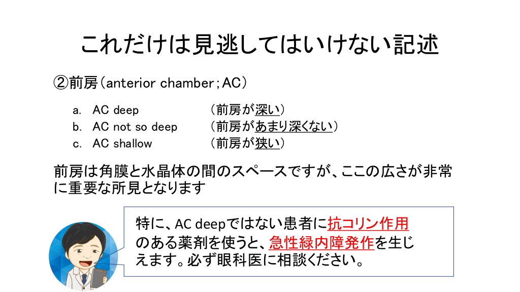 #7. これだけは見逃してはいけない記述 ②前房(anterior chamber;AC) a. AC deep b. AC not so deep c. AC shallow (前房が深い) (前房があまり深くない) (前房が狭い) 前房は角膜と水晶体の間のスペースですが、ここの広さが非常 に重要な所見となります 特に、AC deepではない患者に抗コリン作用 のある薬剤を使うと、急性緑内障発作を生じ えます。必ず眼科医に相談ください。