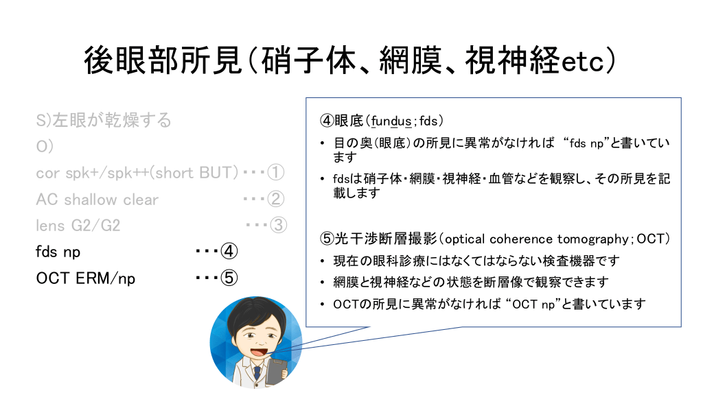 #8. 後眼部所見(硝子体、網膜、視神経etc) S)左眼が乾燥する O) cor spk+/spk++(short BUT)・・・① AC shallow clear ・・・② lens G2/G2 ・・・③ fds np ・・・④ OCT ERM/np ・・・⑤ ④眼底(fundus;fds) • 目の奥(眼底)の所見に異常がなければ “fds np”と書いてい ます • fdsは硝子体・網膜・視神経・血管などを観察し、その所見を記 載します ⑤光干渉断層撮影(optical coherence tomography;OCT) • 現在の眼科診療にはなくてはならない検査機器です • 網膜と視神経などの状態を断層像で観察できます • OCTの所見に異常がなければ “OCT np”と書いています
