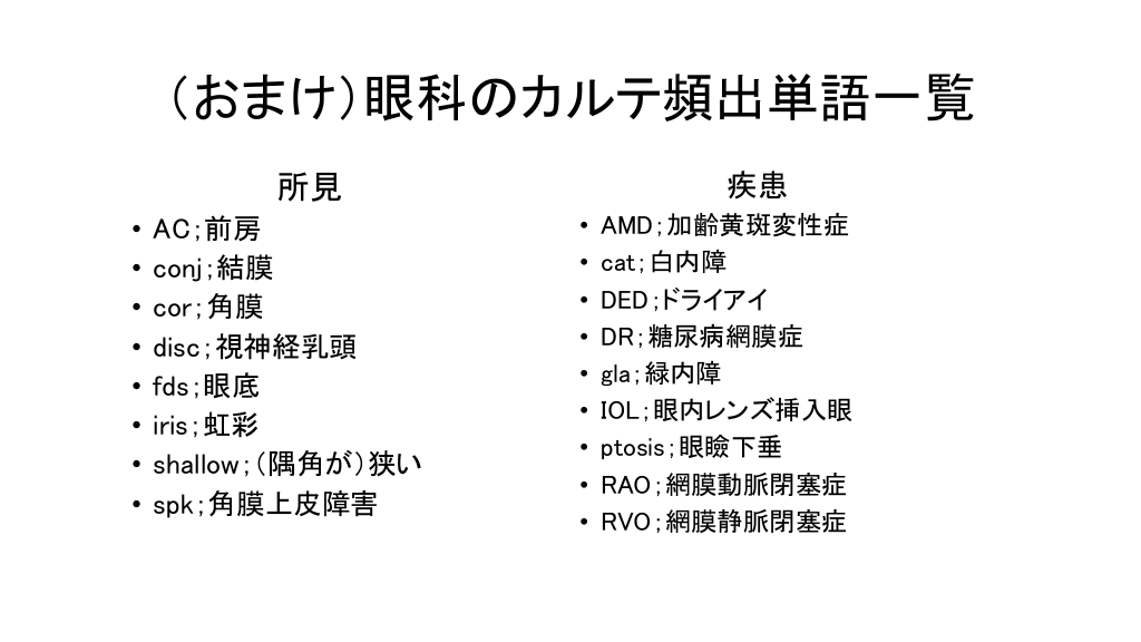 #9. (おまけ)眼科のカルテ頻出単語一覧 疾患 所見 • • • • • • • • AC;前房 conj;結膜 cor;角膜 disc;視神経乳頭 fds;眼底 iris;虹彩 shallow;(隅角が)狭い spk;角膜上皮障害 • • • • • • • • • AMD;加齢黄斑変性症 cat;白内障 DED;ドライアイ DR;糖尿病網膜症 gla;緑内障 IOL;眼内レンズ挿入眼 ptosis;眼瞼下垂 RAO;網膜動脈閉塞症 RVO;網膜静脈閉塞症