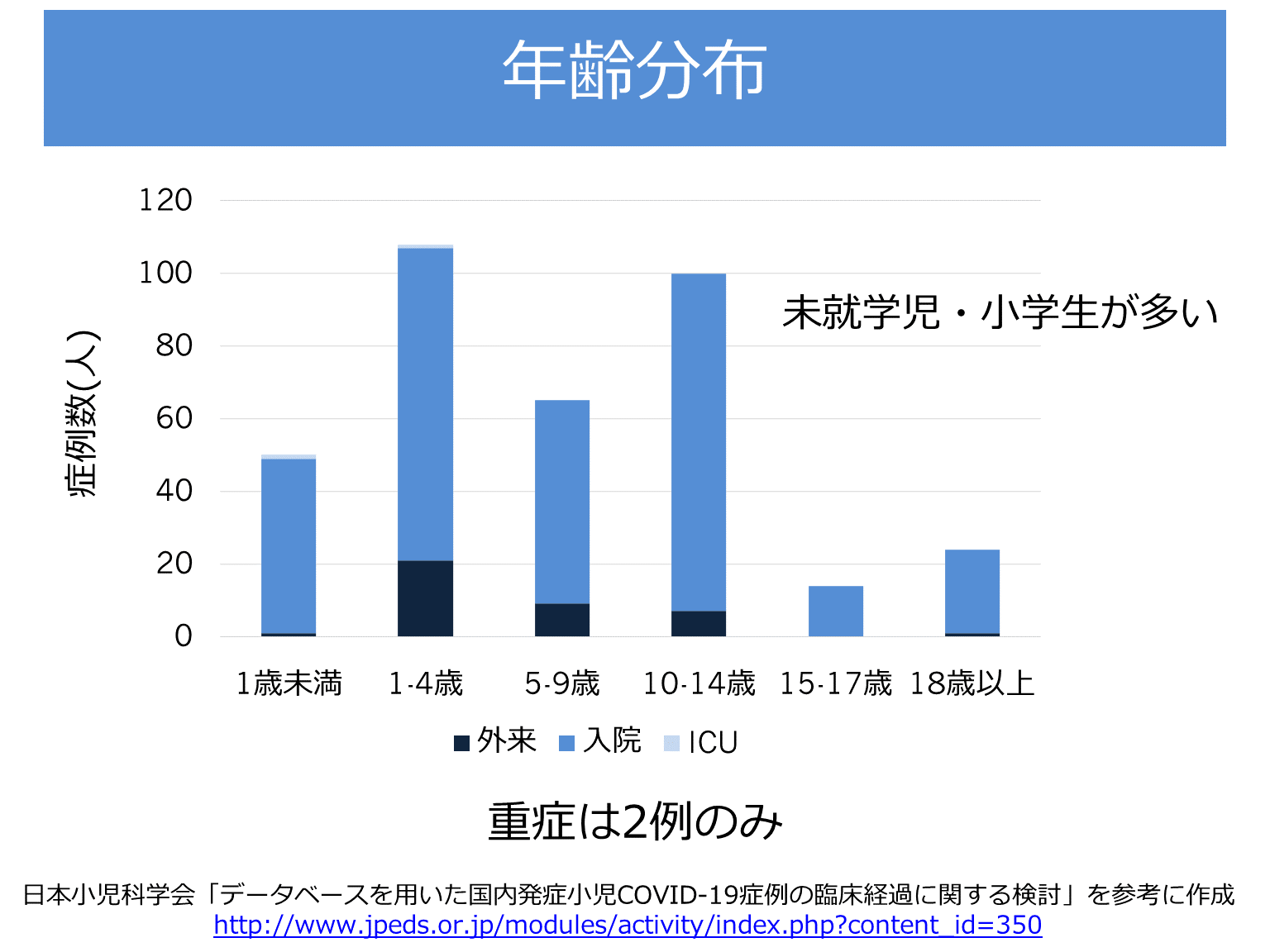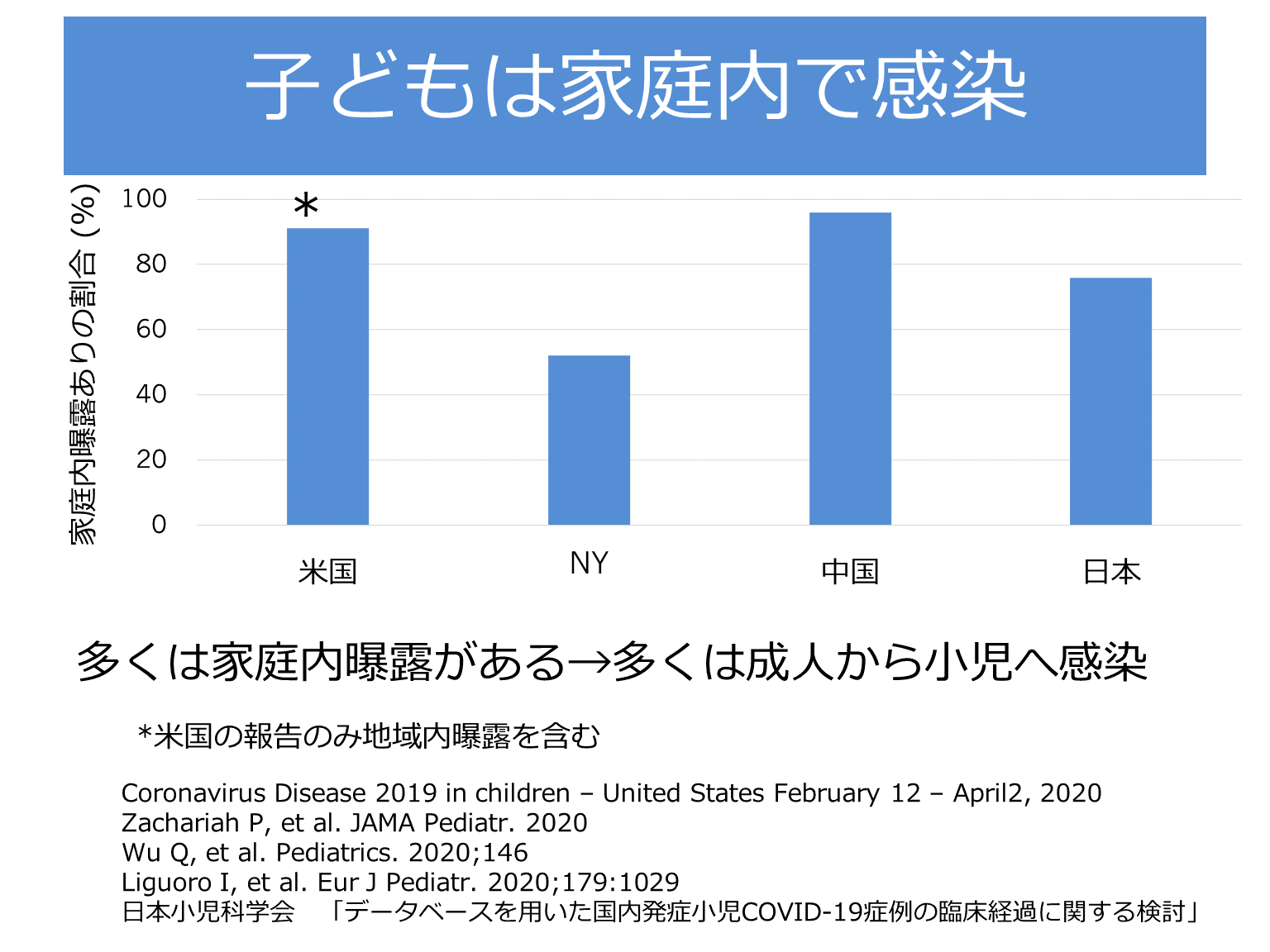 日本小児科学会 「データベースを用いた国内発症小児COVID-19症例の臨床経過に関する検討」 多くは家庭内曝露がある→多くは成人から小児へ感染