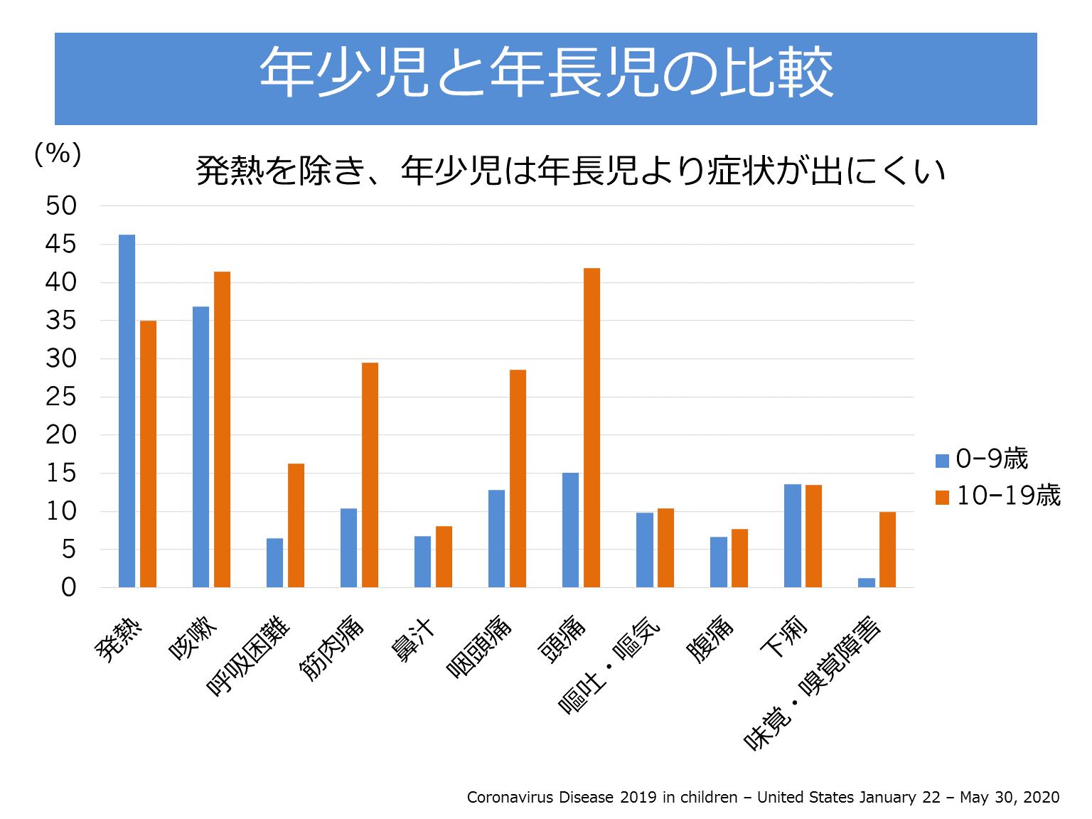 #9. 年少児と年長児の比較 Coronavirus Disease 2019 in children – United States January 22 – May 30, 2020 (%) 発熱を除き、年少児は年長児より症状が出にくい