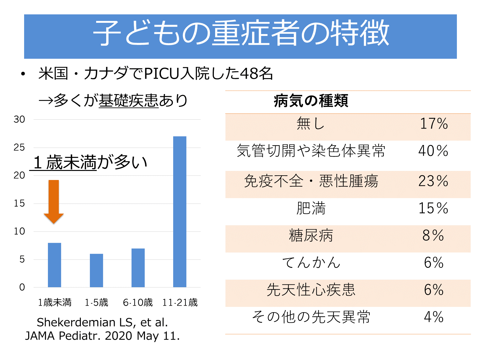 #10. 子どもの重症者の特徴 米国・カナダでPICU入院した48名→多くが基礎疾患あり Shekerdemian LS, et al. JAMA Pediatr. 2020 May 11. 1歳未満が多い
