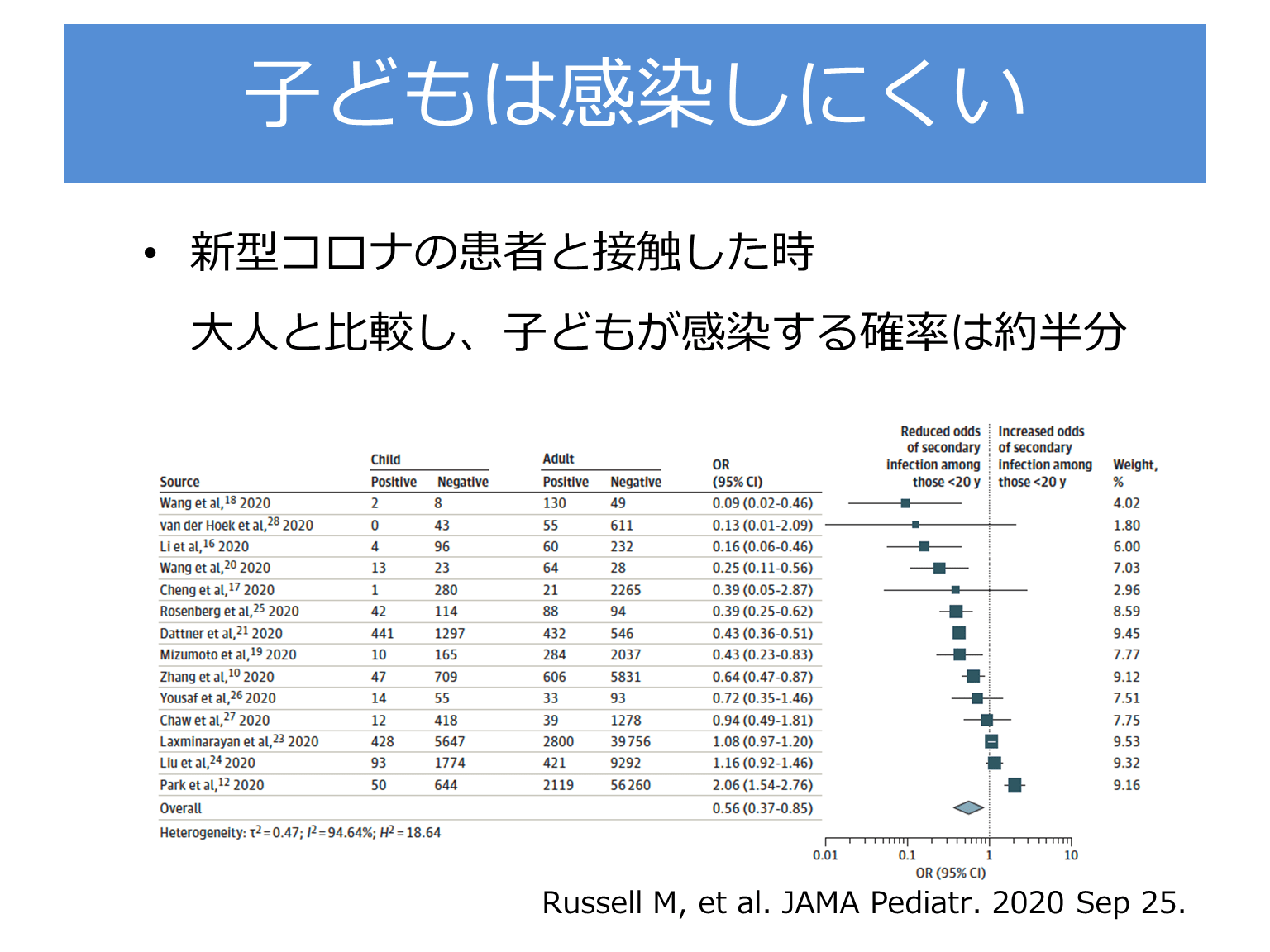 #14. 子どもは感染しにくい 新型コロナの患者と接触した時大人と比較し、子どもが感染する確率は約半分 Russell M, et al. JAMA Pediatr. 2020 Sep 25.