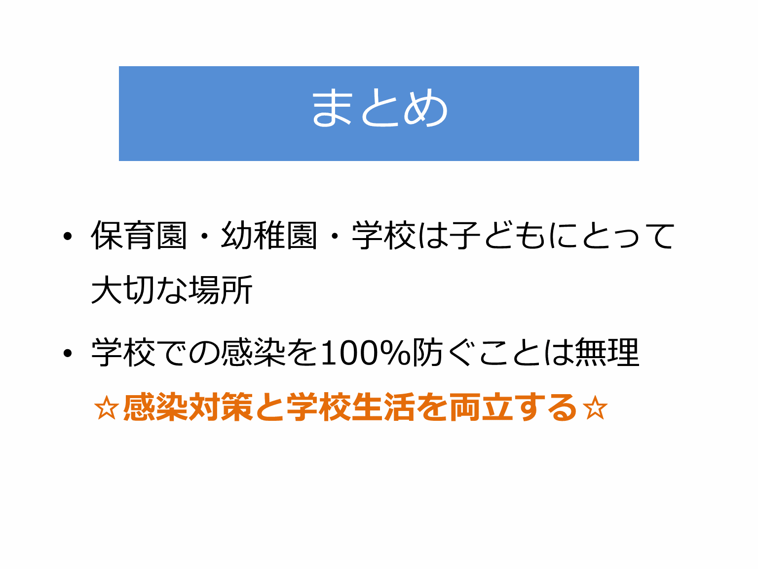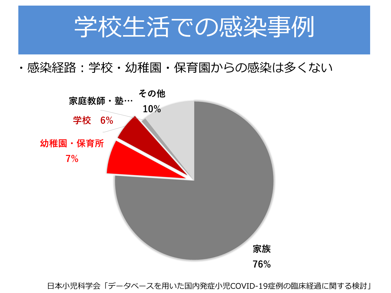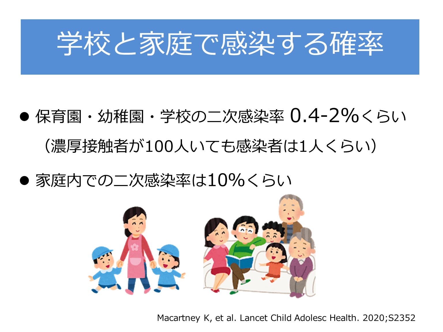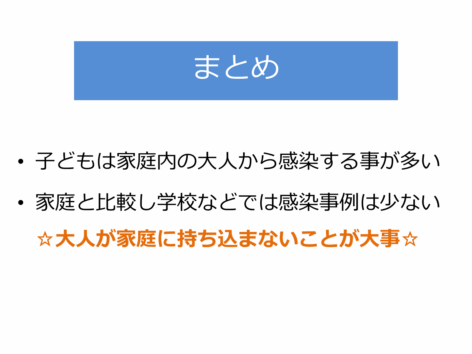 家庭と比較し学校などでは感染事例は少ない☆大人が家庭に持ち込まないことが大事☆