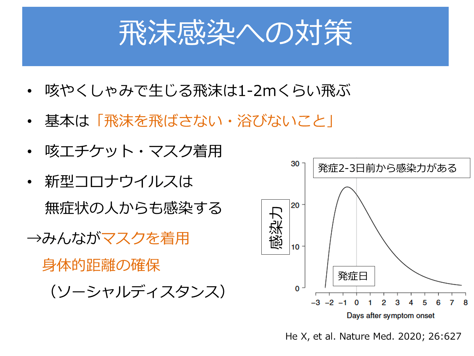 →みんながマスクを着用 身体的距離の確保 (ソーシャルディスタンス) He X, et al. Nature Med. 2020; 26:627 発症日 感染力 発症2-3日前から感染力がある
