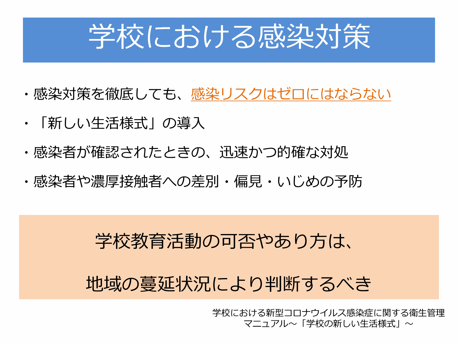 ・感染者や濃厚接触者への差別・偏見・いじめの予防 学校における新型コロナウイルス感染症に関する衛生管理マニュアル〜「学校の新しい生活様式」〜 学校教育活動の可否やあり方は、地域の蔓延状況により判断するべき