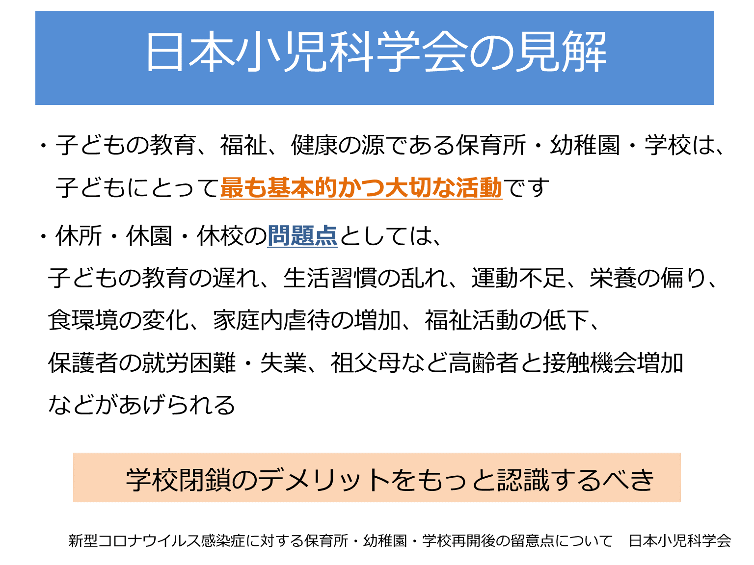 ・休所・休園・休校の問題点としては、 子どもの教育の遅れ、生活習慣の乱れ、運動不足、栄養の偏り、 食環境の変化、家庭内虐待の増加、福祉活動の低下、 保護者の就労困難・失業、祖父母など高齢者と接触機会増加 などがあげられる 新型コロナウイルス感染症に対する保育所・幼稚園・学校再開後の留意点について 日本小児科学会 学校閉鎖のデメリットをもっと認識するべき