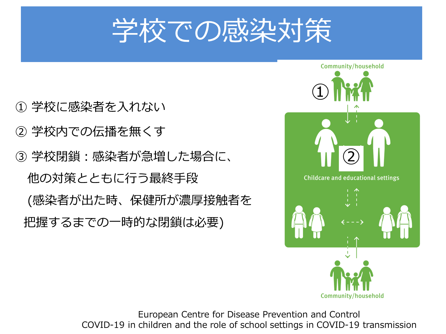 ③ 学校閉鎖:感染者が急増した場合に、 他の対策とともに行う最終手段 (感染者が出た時、保健所が濃厚接触者を 把握するまでの一時的な閉鎖は必要) European Centre for Disease Prevention and Control