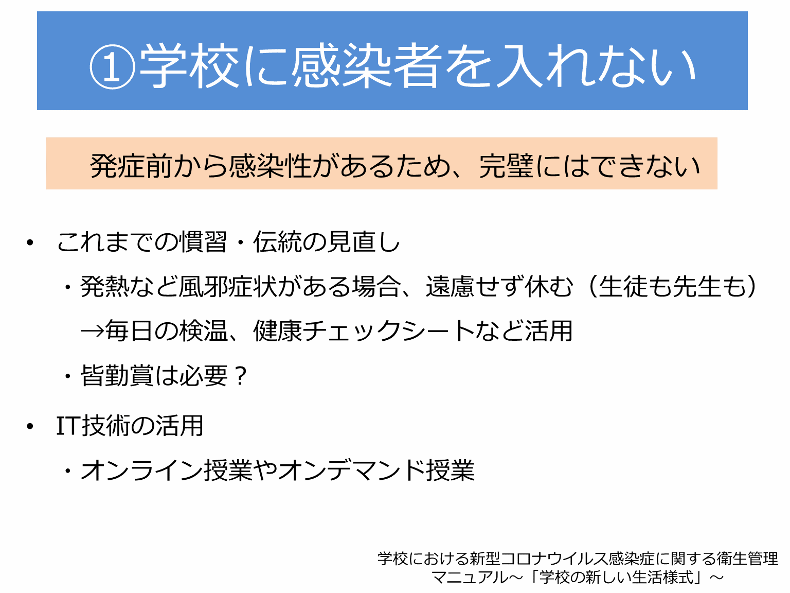 IT技術の活用・オンライン授業やオンデマンド授業 学校における新型コロナウイルス感染症に関する衛生管理マニュアル〜「学校の新しい生活様式」〜 発症前から感染性があるため、完璧にはできない