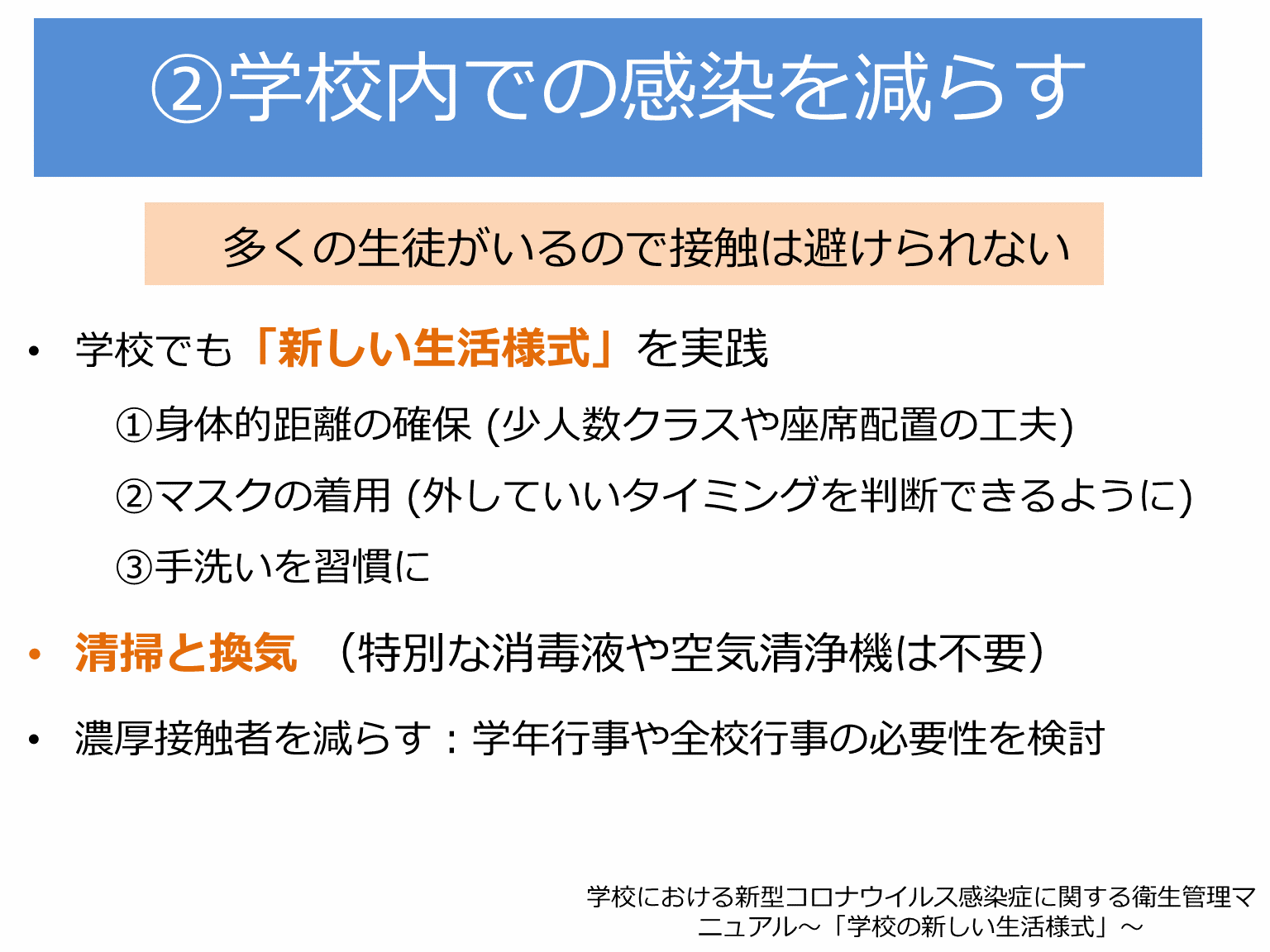 学校における新型コロナウイルス感染症に関する衛生管理マニュアル〜「学校の新しい生活様式」〜 多くの生徒がいるので接触は避けられない