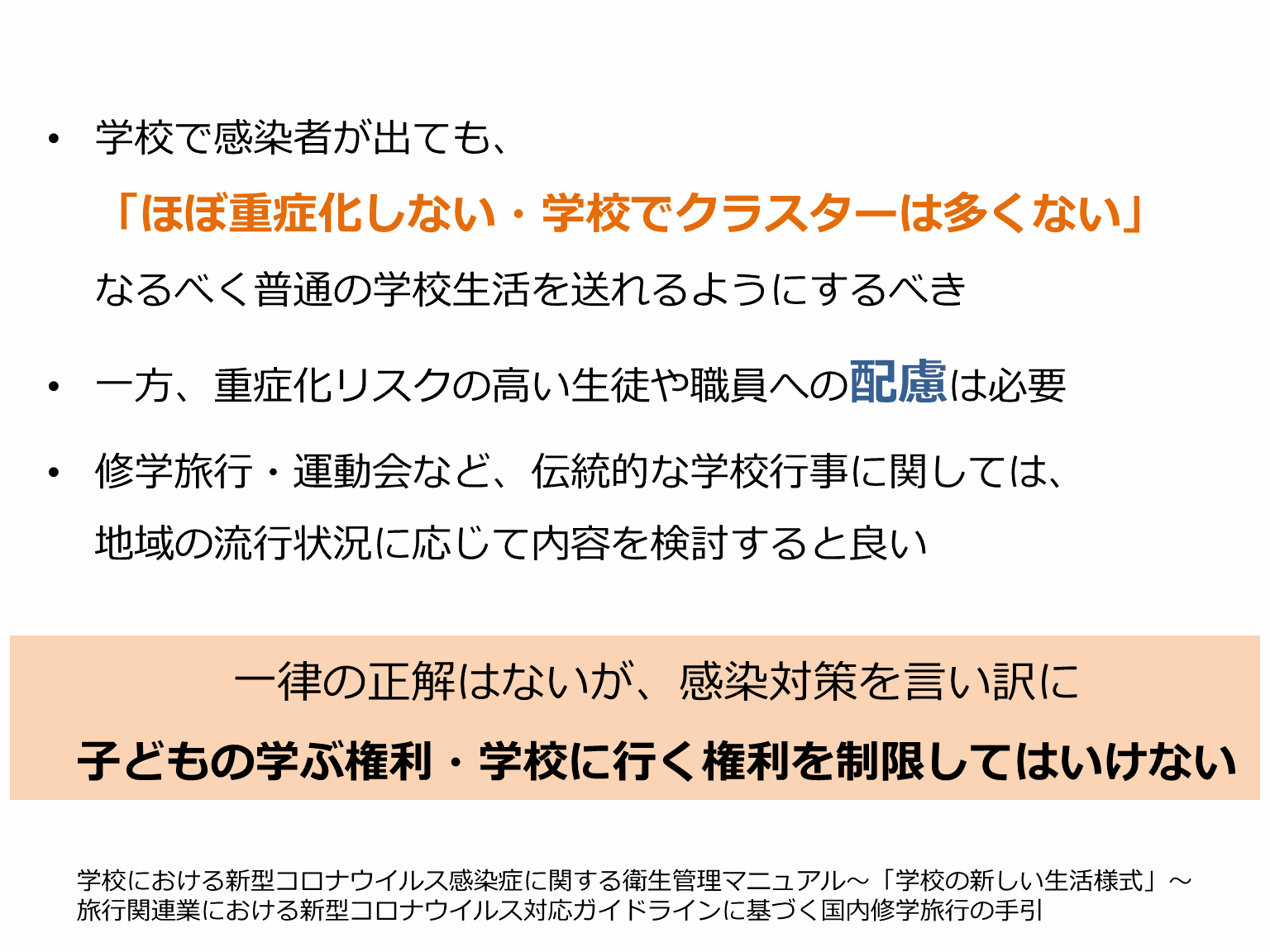 #35. 学校で感染者が出ても、「ほぼ重症化しない・学校でクラスターは多くない」なるべく普通の学校生活を送れるようにするべき