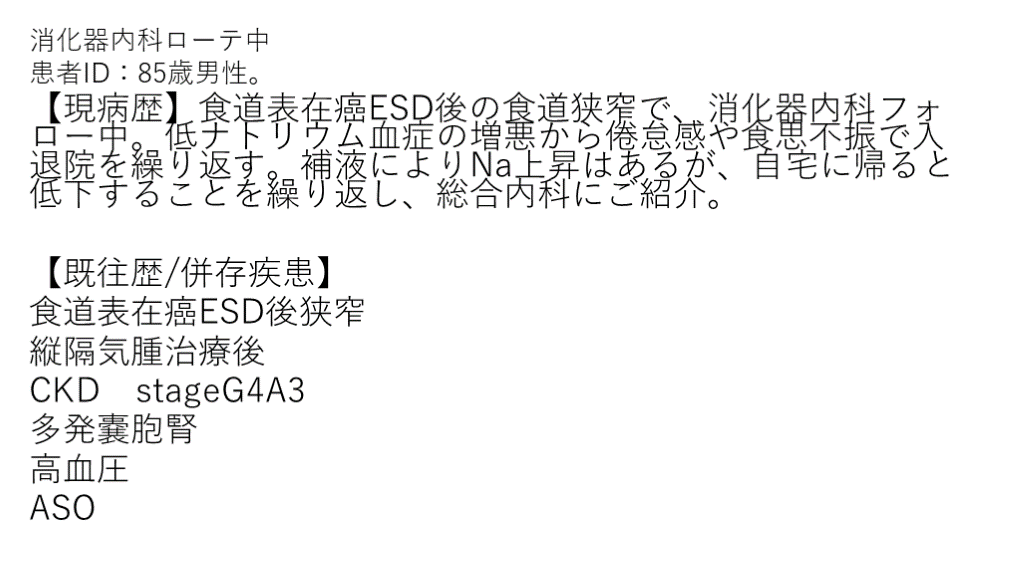 【現病歴】食道表在癌ESD後の食道狭窄で、消化器内科フォロー中。低ナトリウム血症の増悪から倦怠感や食思不振で入退院を繰り返す。補液によりNa上昇はあるが、自宅に帰ると低下することを繰り返し、総合内科にご紹介。