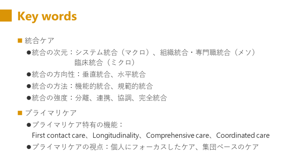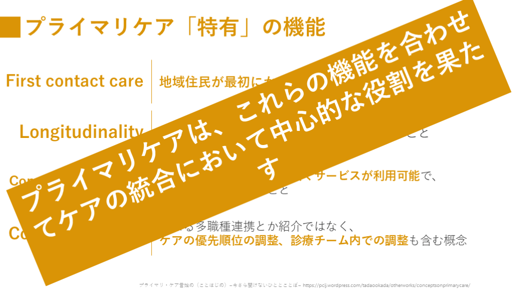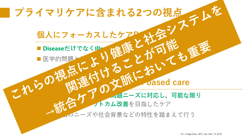 プライマリケアはその理念に統合ケアが組み込まれており、統合ケアの実現に重要な役割を果たす