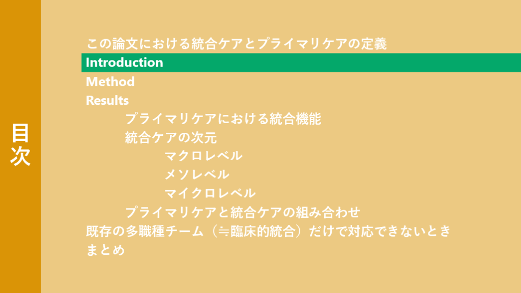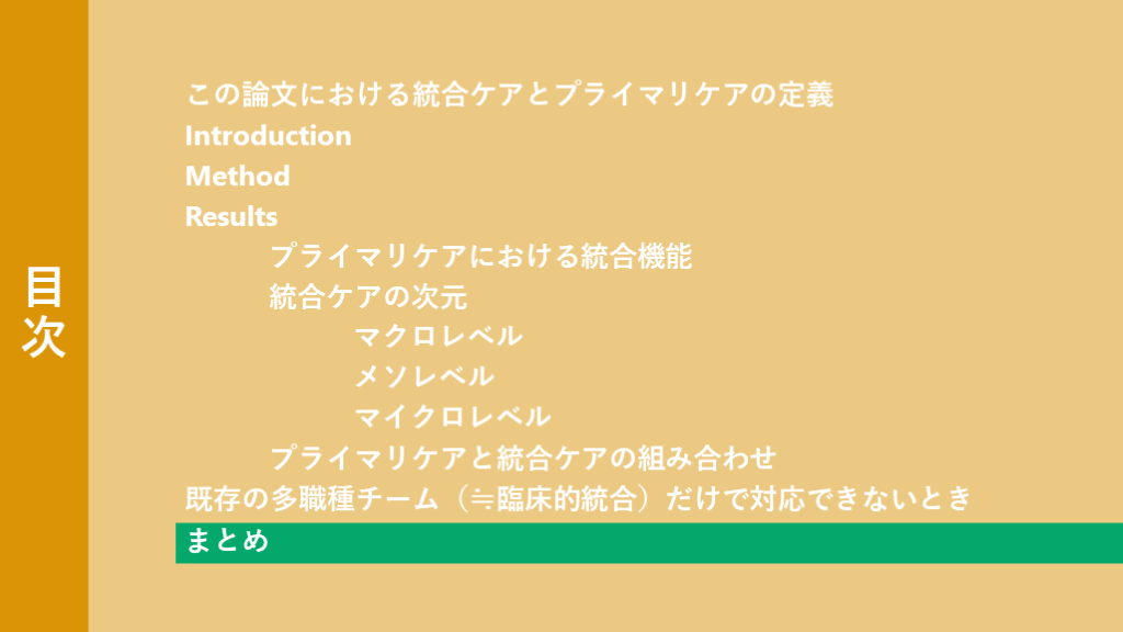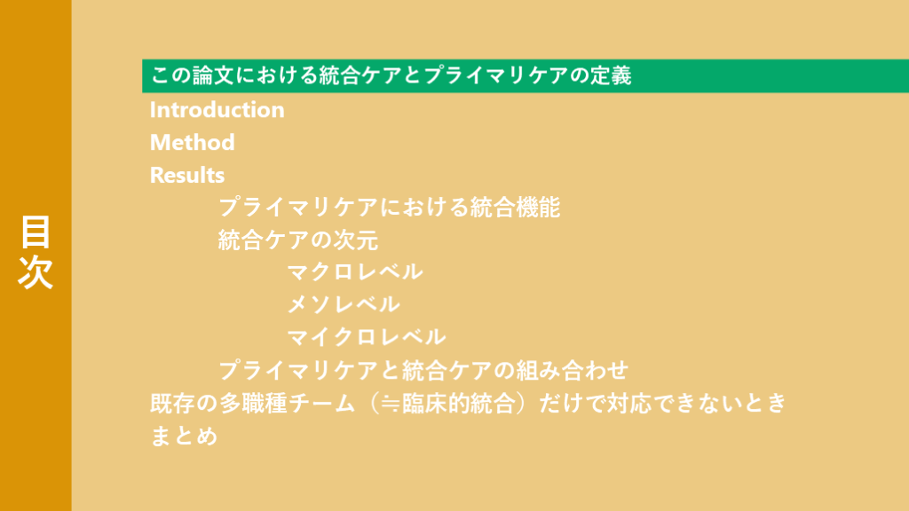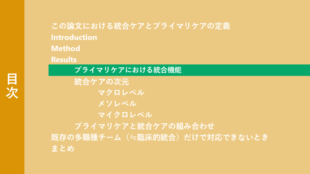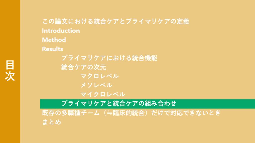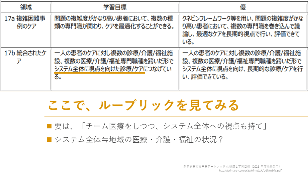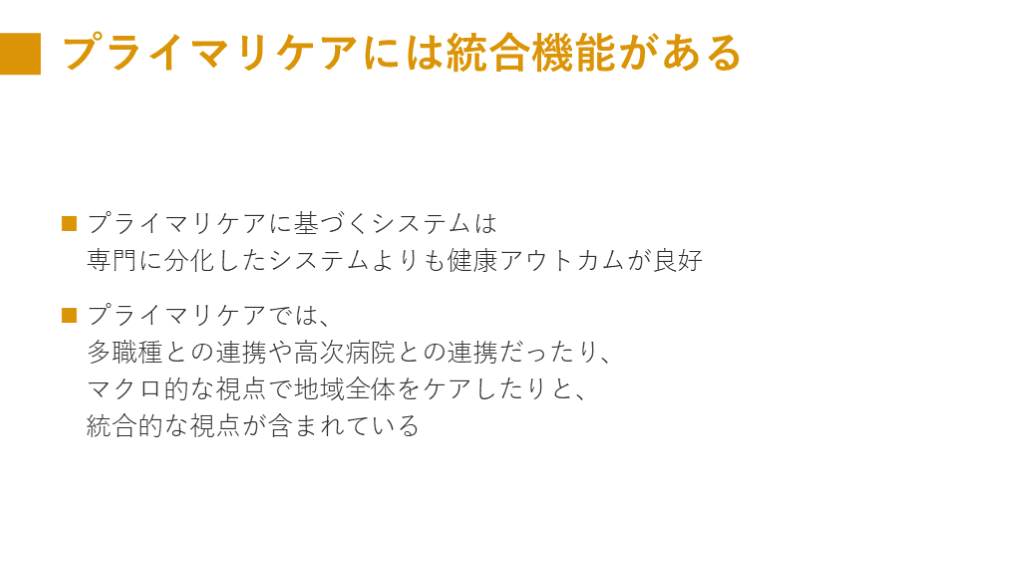 プライマリケアでは、多職種との連携や高次病院との連携だったり、マクロ的な視点で地域全体をケアしたりと、統合的な視点が含まれている