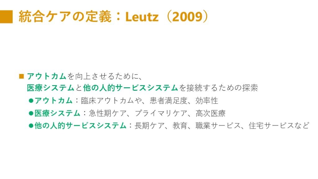 #7. 統合ケアの定義:Leutz(2009) アウトカムを向上させるために、医療システムと他の人的サービスシステムを接続するための探索