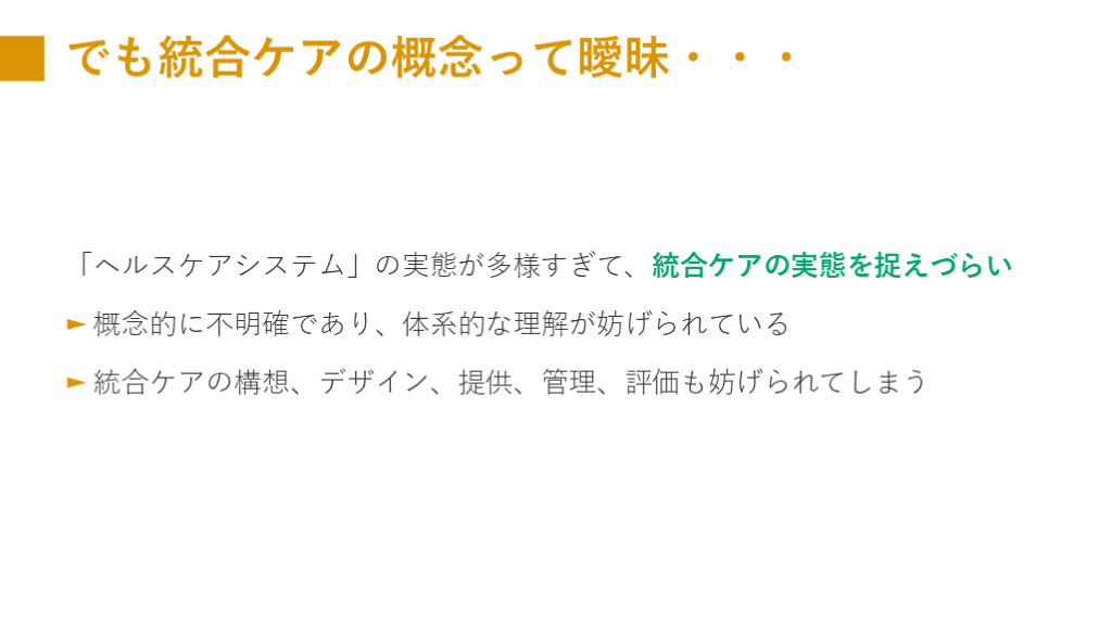 #16. でも統合ケアの概念って曖昧・・・ 「ヘルスケアシステム」の実態が多様すぎて、統合ケアの実態を捉えづらい
