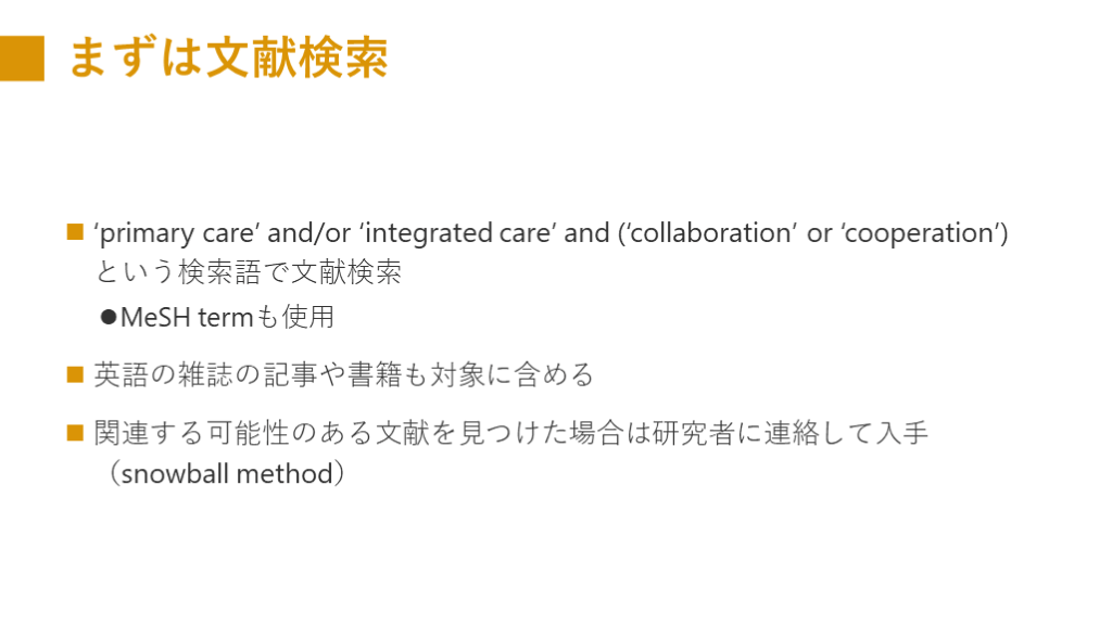 #20. まずは文献検索 ‘primary care’ and/or ‘integrated care’ and (‘collaboration’ or ‘cooperation’)という検索語で文献検索