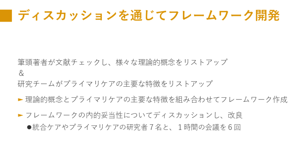 #21. ディスカッションを通じてフレームワーク開発 筆頭著者が文献チェックし、様々な理論的概念をリストアップ&研究チームがプライマリケアの主要な特徴をリストアップ