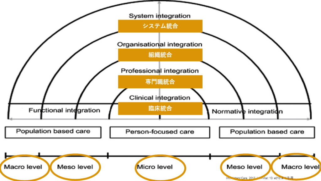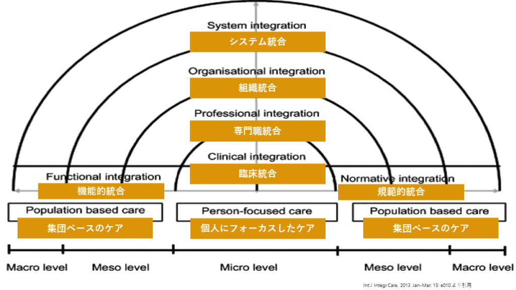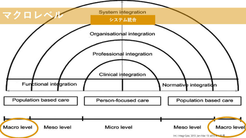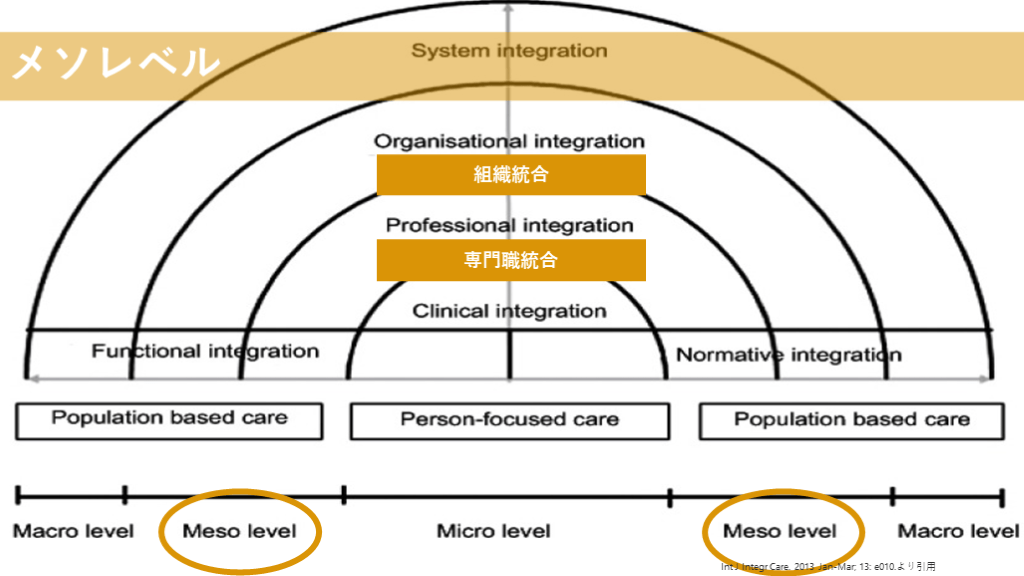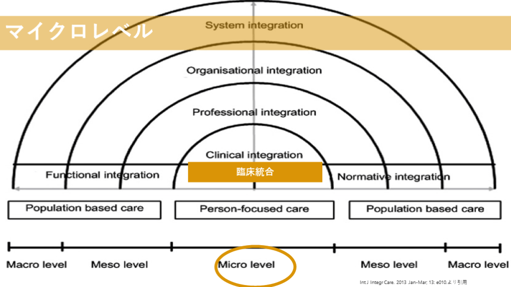 統合の次元:システム統合(マクロ)、組織統合・専門職統合(メソ) 臨床統合(ミクロ)