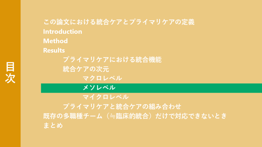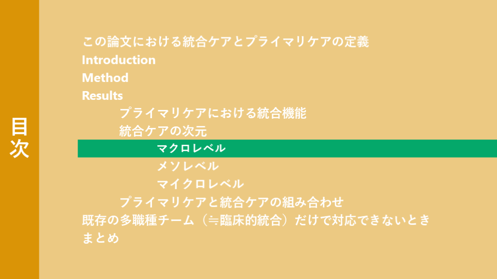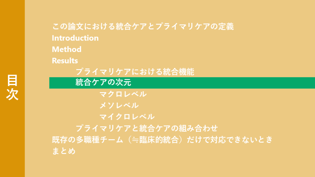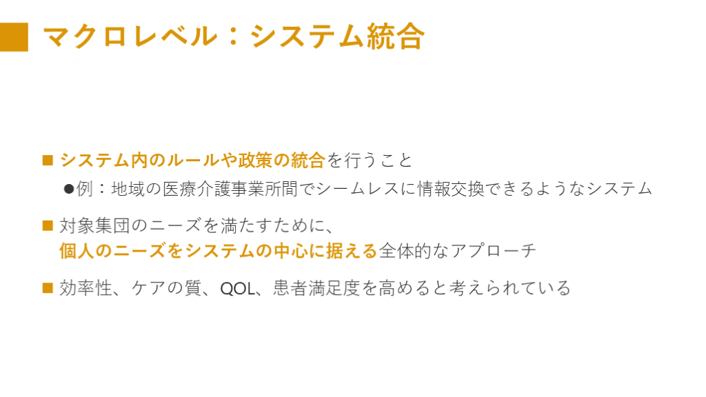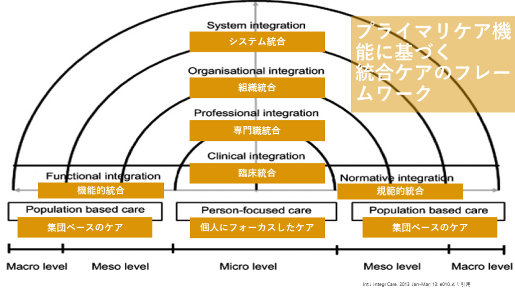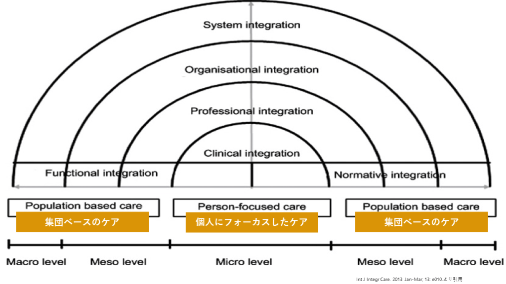 統合の次元:システム統合(マクロ)、組織統合・専門職統合(メソ) 臨床統合(ミクロ)