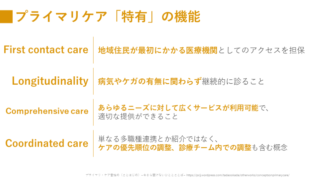 プライマリケア特有の機能:First contact care、Longitudinality、Comprehensive care、Coordinated care