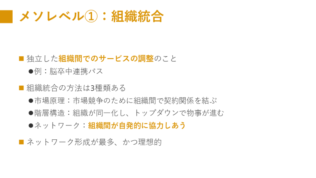 #39. メソレベル①:組織統合 独立した組織間でのサービスの調整のこと