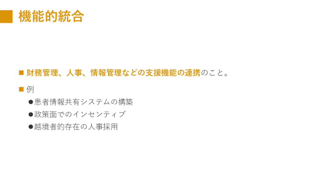 #47. 機能的統合 財務管理、人事、情報管理などの支援機能の連携のこと。