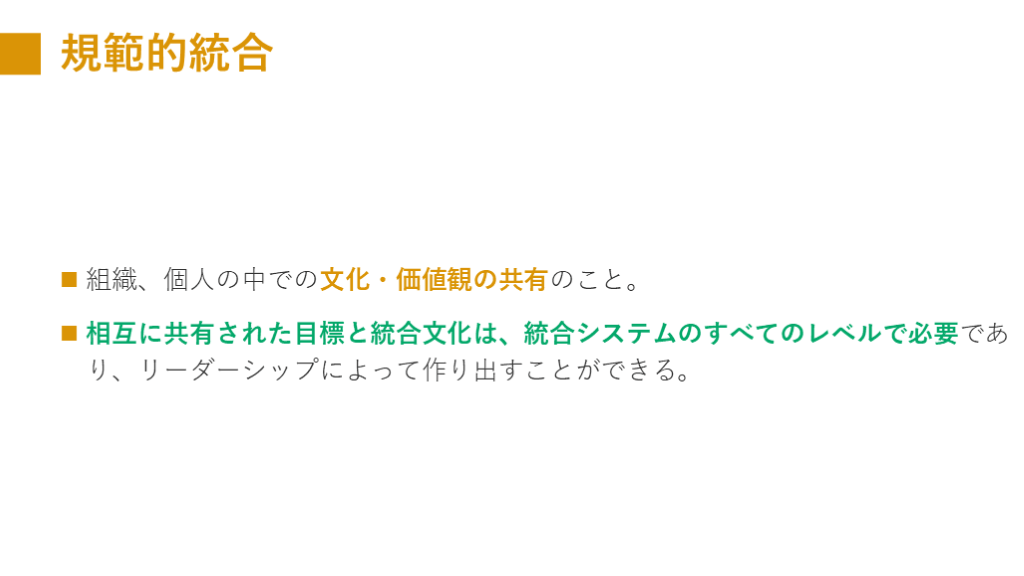 #48. 規範的統合 組織、個人の中での文化・価値観の共有のこと。