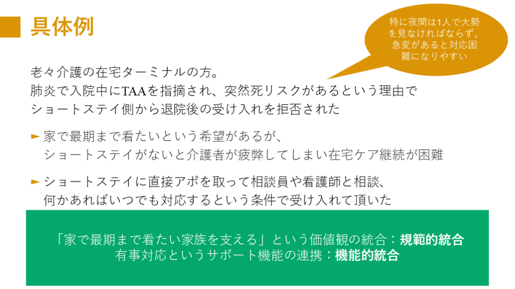 有事対応というサポート機能の連携:機能的統合 特に夜間は1人で大勢を見なければならず、急変があると対応困難になりやすい