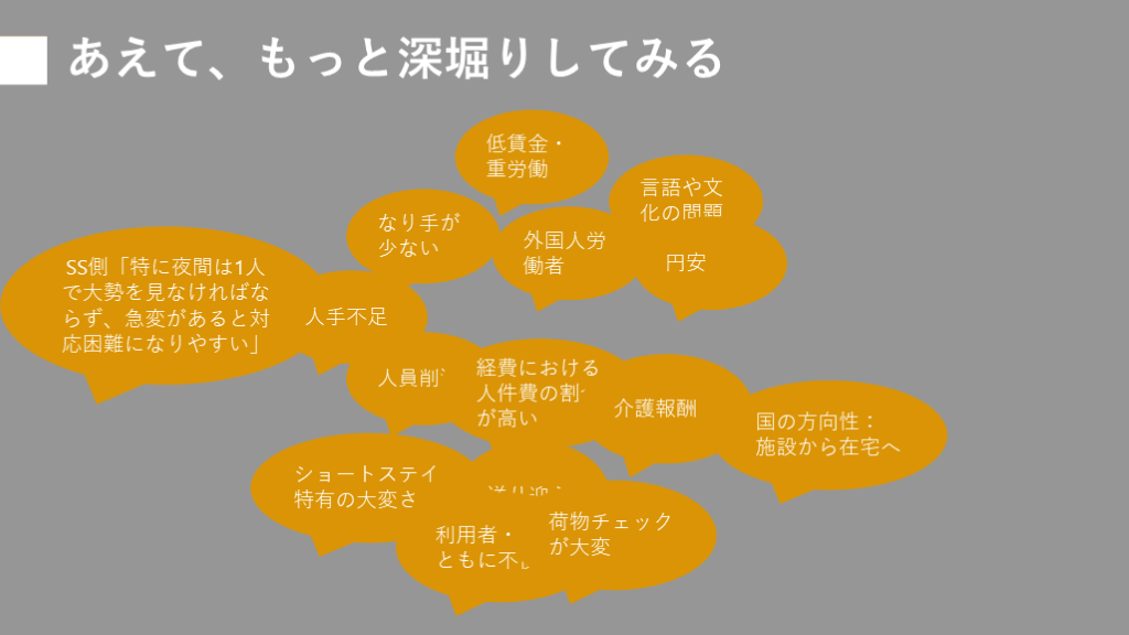 #53. あえて、もっと深堀りしてみる SS側「特に夜間は1人で大勢を見なければならず、急変があると対応困難になりやすい」 人手不足 なり手が少ない 人員削減 経費における人件費の割合が高い 介護報酬 低賃金・重労働 外国人労働者 言語や文化の問題 円安 国の方向性: