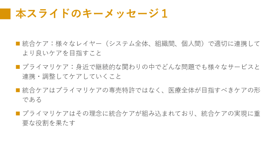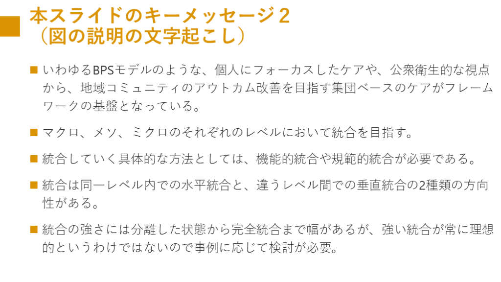 #55. 本スライドのキーメッセージ1 統合ケア:様々なレイヤー(システム全体、組織間、個人間)で適切に連携してより良いケアを目指すこと
