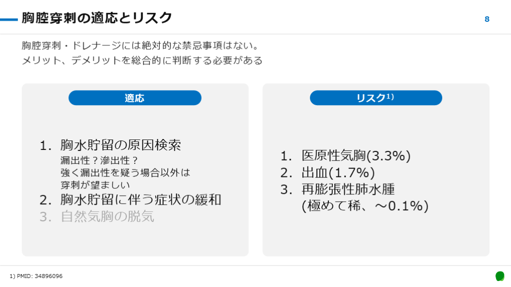 メリット、デメリットを総合的に判断する必要がある 8 1) PMID: 34896096 適応 胸水貯留の原因検索漏出性?滲出性?強く漏出性を疑う場合以外は穿刺が望ましい