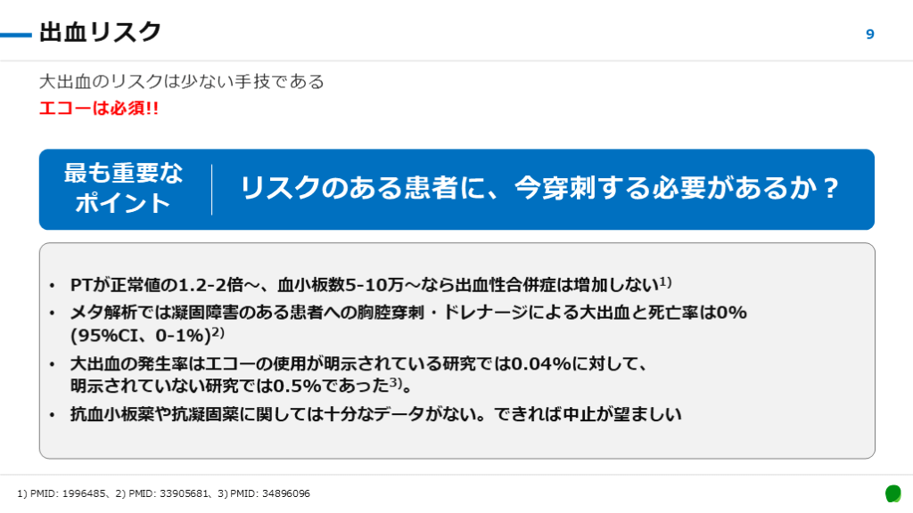 エコーは必須!! 9 1) PMID: 1996485、2) PMID: 33905681、3) PMID: 34896096 最も重要なポイント リスクのある患者に、今穿刺する必要があるか? PTが正常値の1.2-2倍〜、血小板数5-10万〜なら出血性合併症は増加しない1)