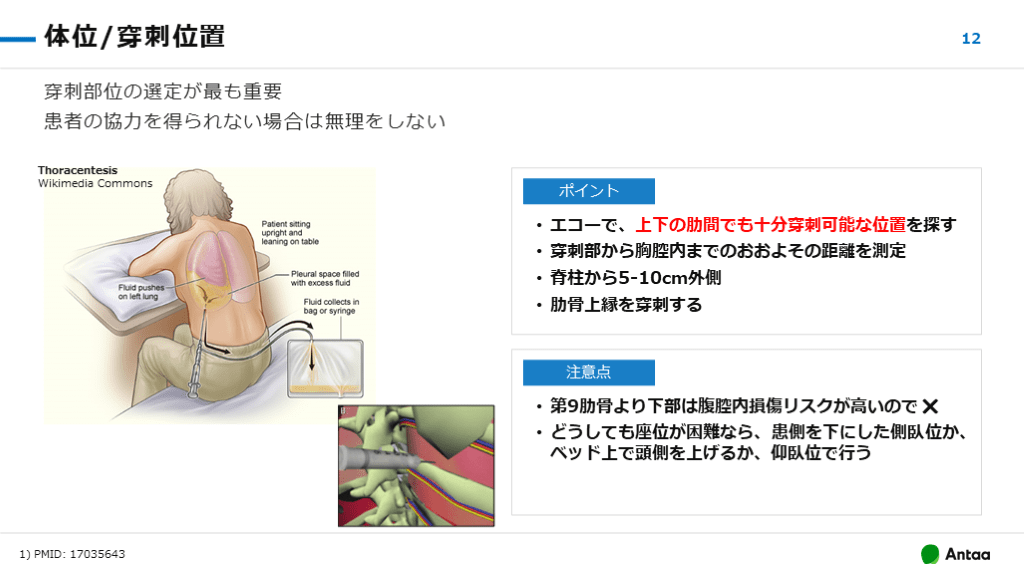 どうしても座位が困難なら、患側を下にした側臥位か、ベッド上で頭側を上げるか、仰臥位で行う 注意点 Thoracentesis