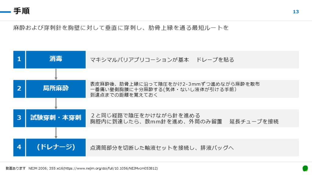 #13. 手順 麻酔および穿刺針を胸壁に対して垂直に穿刺し、肋骨上縁を通る最短ルートを 13 動画あります NEJM 2006; 355:e16(https://www.nejm.org/doi/full/10.1056/NEJMvcm053812) 消毒 マキシマルバリアプリコーションが基本 ドレープを貼る 局所麻酔 表皮麻酔後、肋骨上縁に沿って陰圧をかけ2-3mmずつ進めながら麻酔を散布
