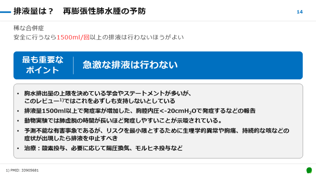 安全に行うなら1500ml/回以上の排液は行わないほうがよい 14 1) PMID: 33905681 最も重要なポイント 急激な排液は行わない 胸水排出量の上限を決めている学会やステートメントが多いが、このレビュー1)ではこれを必ずしも支持しないとしている