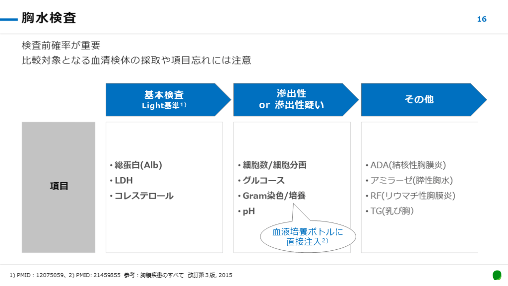 比較対象となる血清検体の採取や項目忘れには注意 16 1) PMID:12075059、2) PMID: 21459855 参考:胸膜疾患のすべて 改訂第3版, 2015 基本検査