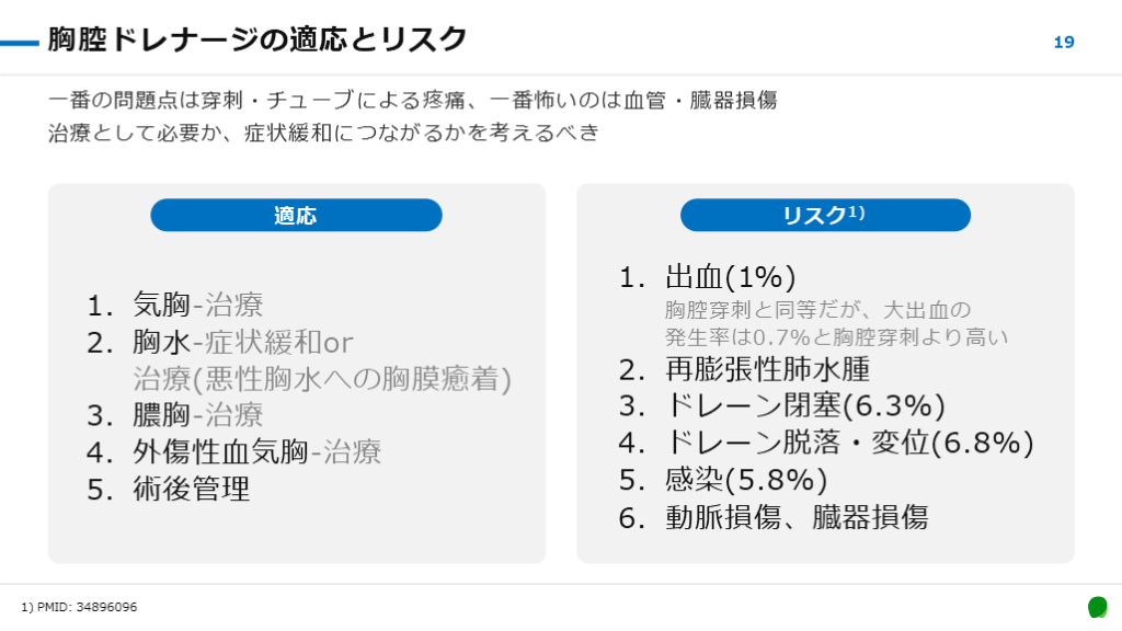 #19. 胸腔ドレナージの適応とリスク 一番の問題点は穿刺・チューブによる疼痛、一番怖いのは血管・臓器損傷