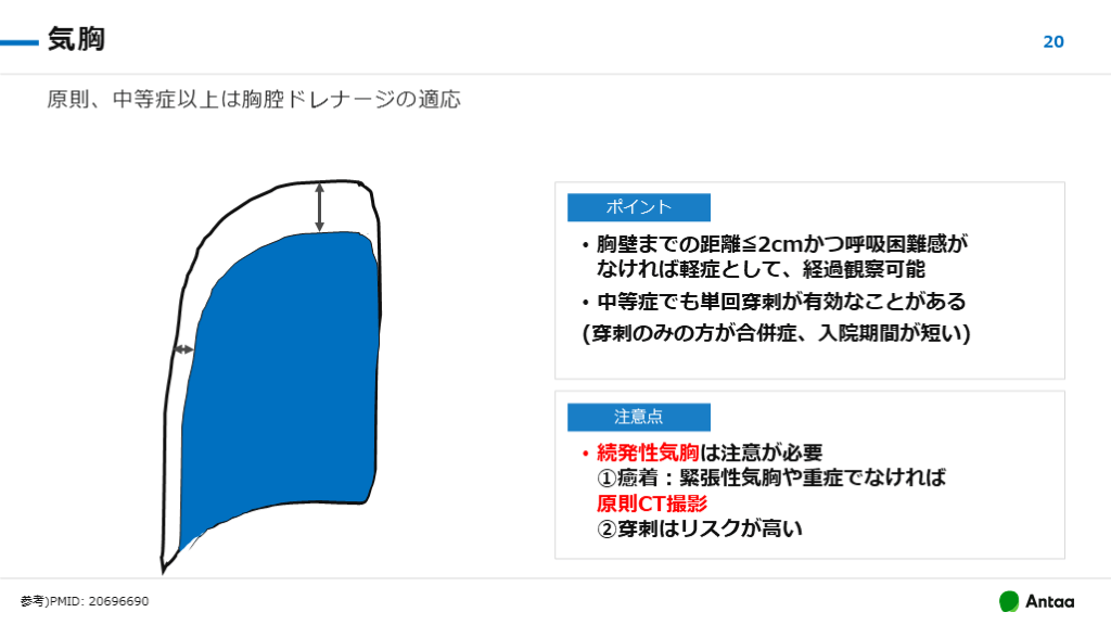 #20. 20 参考)PMID: 20696690 気胸 原則、中等症以上は胸腔ドレナージの適応 胸壁までの距離≦2cmかつ呼吸困難感がなければ軽症として、経過観察可能