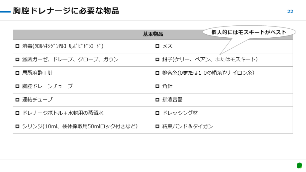 #22. 胸腔ドレナージに必要な物品 22 個人的にはモスキートがベスト