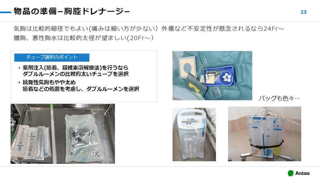 #23. 23 物品の準備−胸腔ドレナージ− 気胸は比較的細径でもよい(痛みは細い方が少ない)外傷など不安定性が懸念されるなら24Fr〜